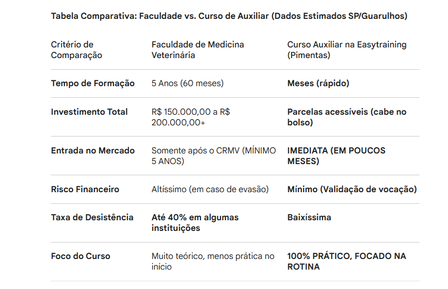 Sim, estrategicamente é a melhor escolha. Em geral o curso de auxiliar de veterinário permite que você conheça a rotina real de um hospital veterinário investindo uma fração do valor de uma mensalidade da faculdade. Isso reduz o risco de desistência da graduação (que chega a 40%) e garante que você entre na faculdade já com experiência técnica, destacando-se dos demais alunos